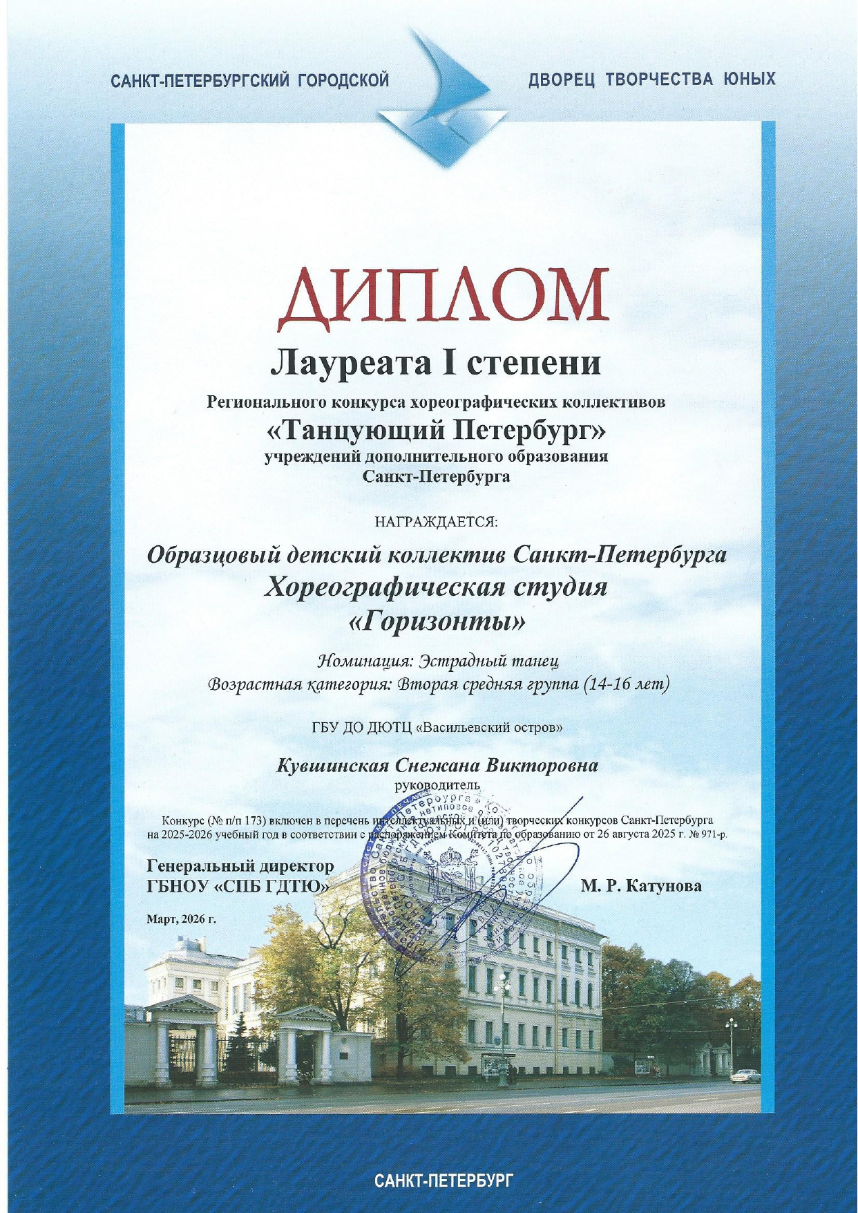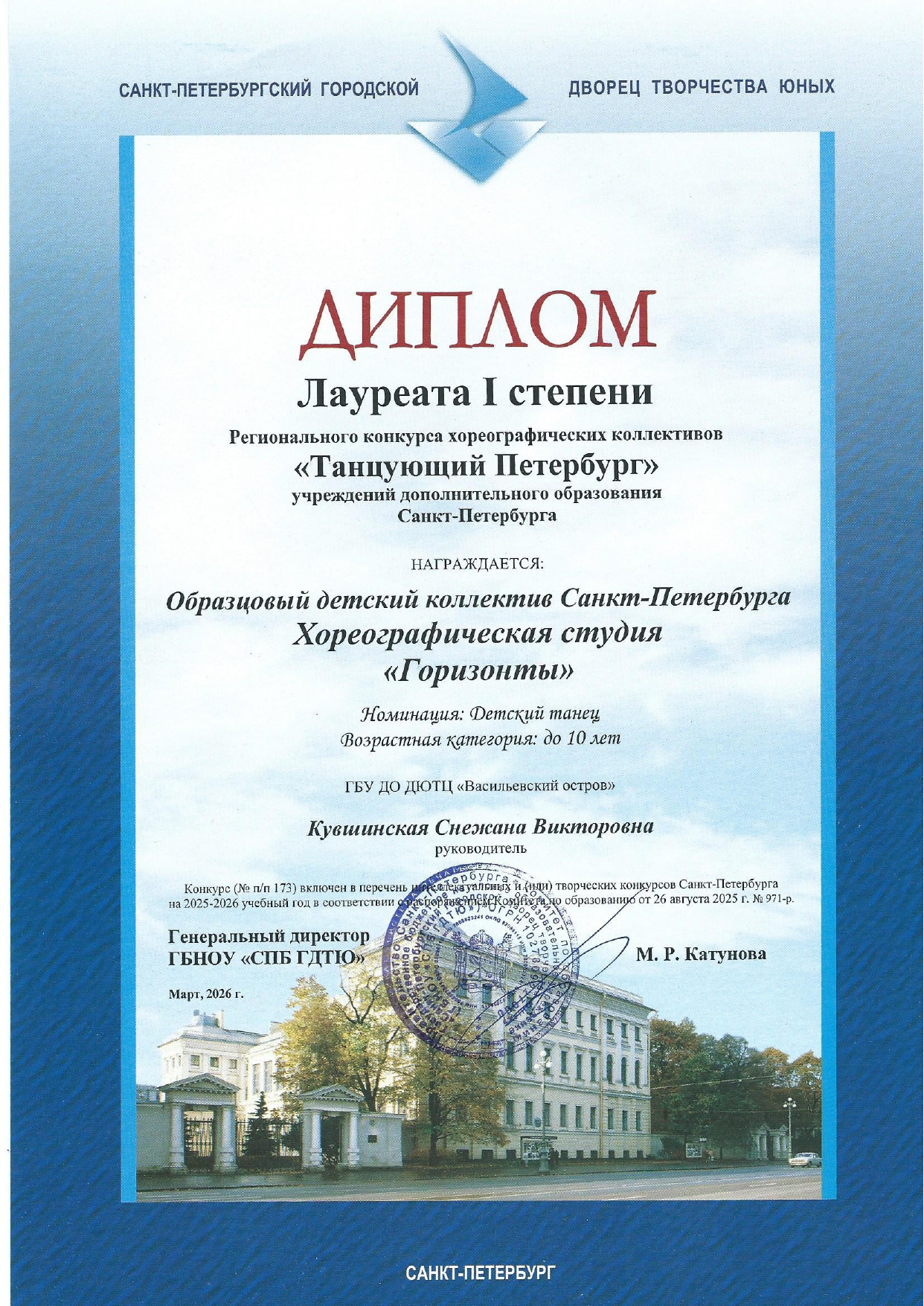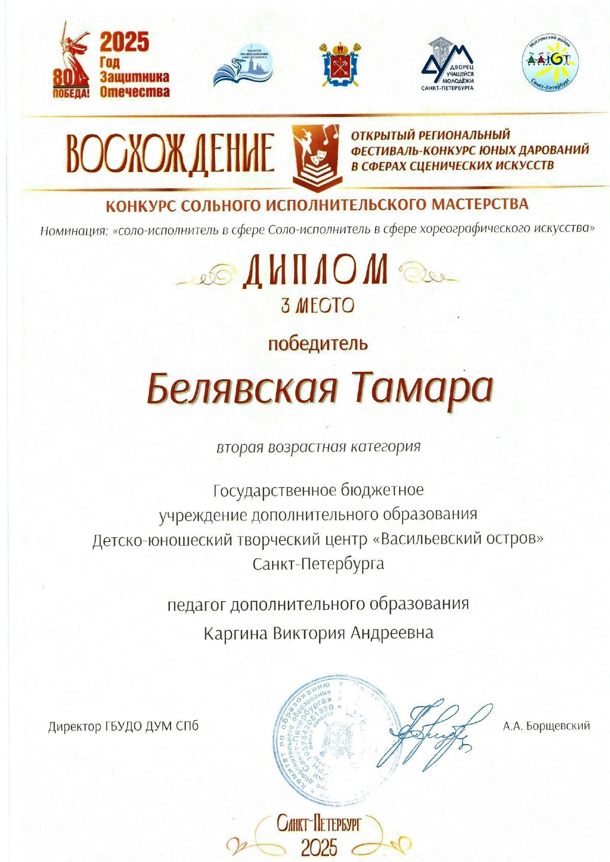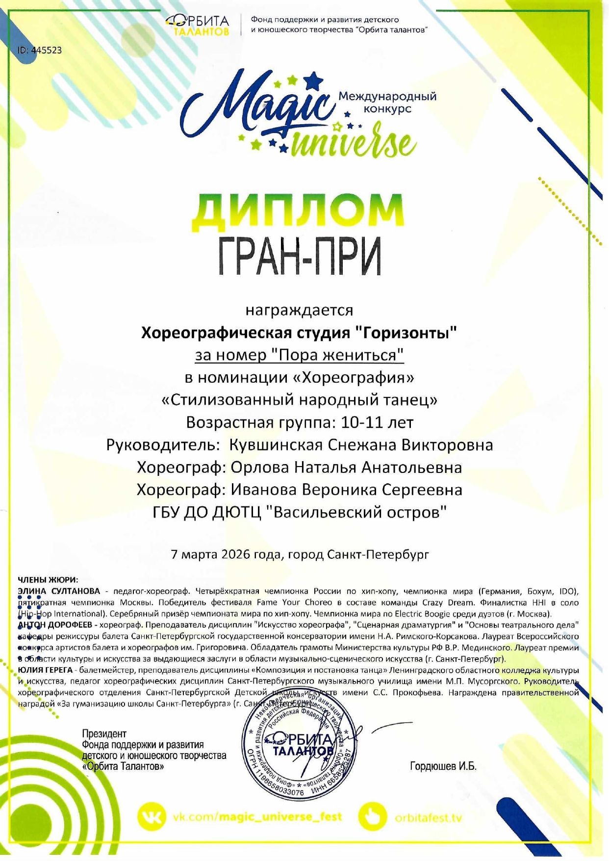 Отзыв Ануфриевой Светланы Геннадьевны, доцента кафедры "Хореографическое искусство" Санкт-Петербургского Гуманитарного Университета профсоюзов, доцента кафедры "Режиссура балета" Санкт-Петербургской государственной Консерватории имени Н.А. Римского-Корсакова, обладателя Гран-при и лауреата международных и всероссийских конкурсов по балетмейстерскому и исполнительскому искусству.